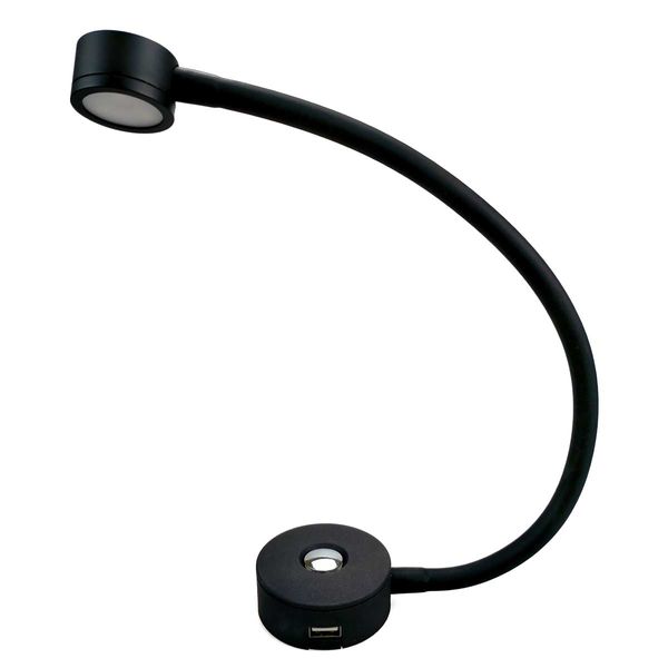 This Dimatec flexi LED spot light is a practicle yet sleek design with its flexible neck and black finish, it can be positioned to wherever you need it. It emits a cosy and focused 105 lumens with a colour temperature of 3200K warm white. Operating at just 2W it is a great energy saving choice, which is also integrated with a USB port enabling smartphones, tablets or any other USB-compatible rechargeable device to be charged.